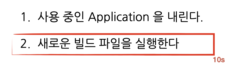 먼저 사용 중인 Application 를 내리고 새로운 Application이 요청 처리를 준비할 때 사이에 텀이 존재한다는 것이다. 이번 프로젝트의 경우 그 시간이 10초 정도 소요되었고, 그 10초 동안은 사용자의 요청을 처리할 수 없게 되는 것이다.