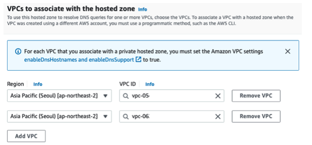 접근할 수 있는 VPC를 선택한다. 여기까지는 일반적인 Route53을 사용하는 방법과 다르지 않다.