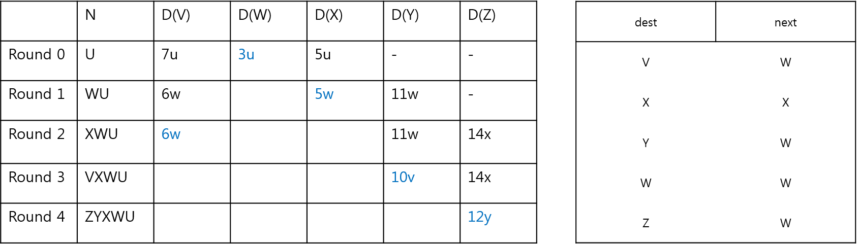 - 위 최소 경로 트리가 곧 U 노드를 기준으로 해당 네트워크 안에서 최소 비용으로 목적지에 도달 할 수 있도록 하는 노드가 된다. 트리를 찾는 프로세스와 포워딩 테이블은 다음처럼 표로 나타낸다.