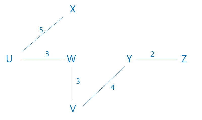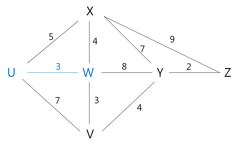 - 위 예시에서 처음 기준 노드를 U라고 했을 때, N 집합은 자신 뿐이다. N 집합에서 이웃된 노드(X, W, V) 중에 최소 비용으로 도달할 수 있는 지점은 W이므로, N 집합에 W를 추가한다.
