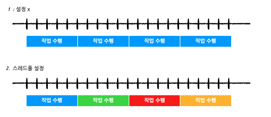 안된다. 그저 다른 스레드로 처리할 뿐 각 작업은 동기적으로 처리하고 있다. 아래 그림에서 1번은 스레드 풀 설정을 하지 않았던 경우, 2번은 스레드 풀 설정으로 서로 다른 스레드로 작업을 수행하는 경우를 표시해보았다.