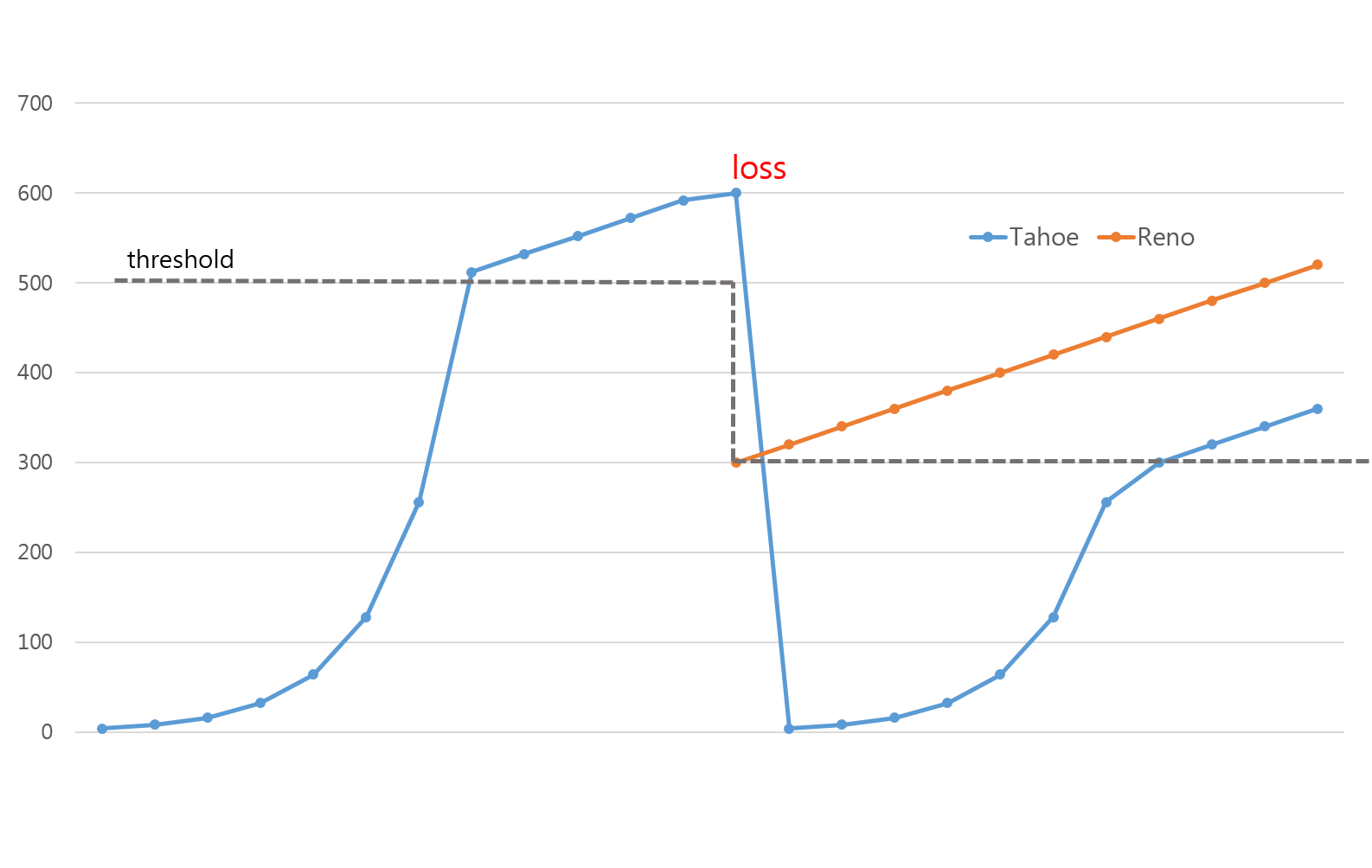 따라서 이 두가지 경우를 나눠 loss가 발생했을 시 아예 불능 상황인 time out에서는 congwin 사이즈를 아예 처음부터 작은 값으로 시작하여 큰 단위로 증가하고 (Tahoe 방식), 그렇지 않은 duplicated ack 상황에서는 threshold만 수정하고 그 threshold부터 다시 천천히 크기를 증가시켜 (Reno 방식), 더 효율적인 congestion control을 가능하도록 한다.