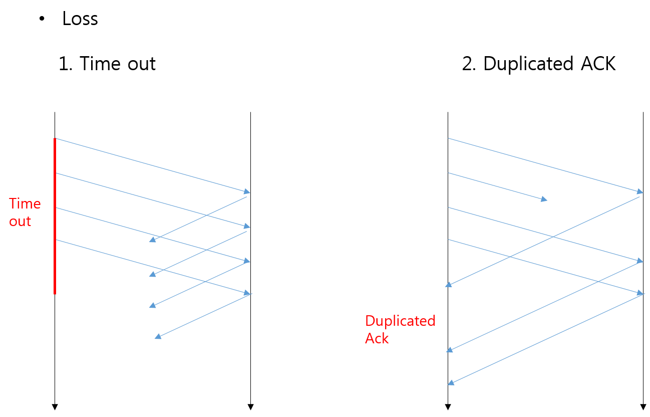 Loss를 확인하는 방식으로는 time out과 duplicated ack 두가지가 있다. time out 상황은 이후 송수신 여부를 전혀 확인 할 수 없는 네트워크 지연/불능 상황으로, Duplicated Ack는 소수의 패킷만이 loss된 상황에서 다른 응답은 확인이 가능한 상태이므로 불능 상황은 아님은 확인 할 수 있다.