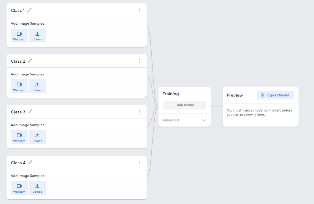 좌측 class 라인에 분류할 이미지 class 별 명칭을 적고, 웹캠이나 직접 사진을 업로드하여 Training하면 끝.