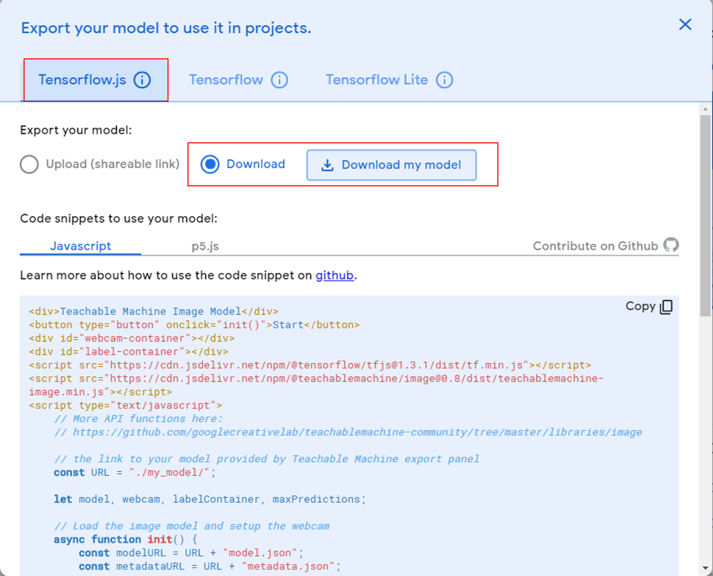 - 학습을 마치고, Export Model -> Tensorflow.js (Code) -> Download model (Model)