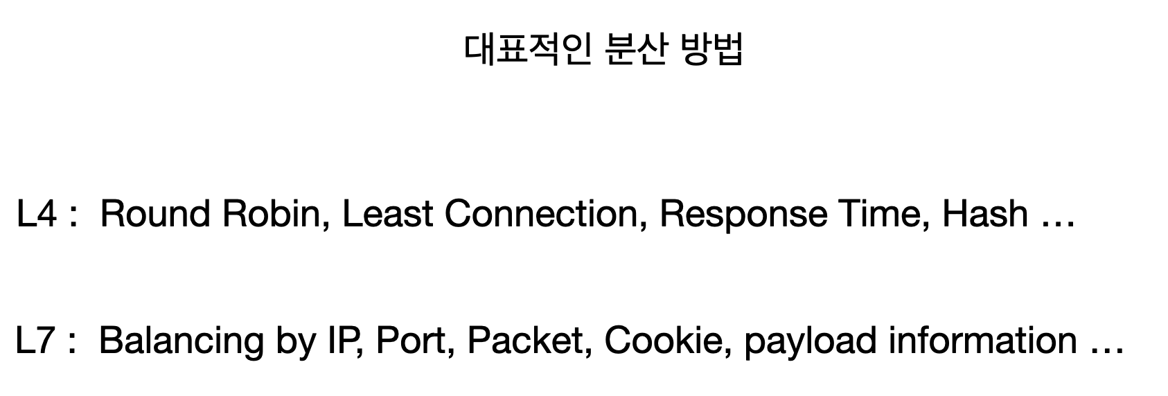 대표적으로는 OSI7 계층의 4레벨(Transport), 7레벨(Application)을 이용하는 방식이 있다. 이름으로도 충분히 분산 기준을 유추할 수 있으므로, 자세한 방식은 생략한다.