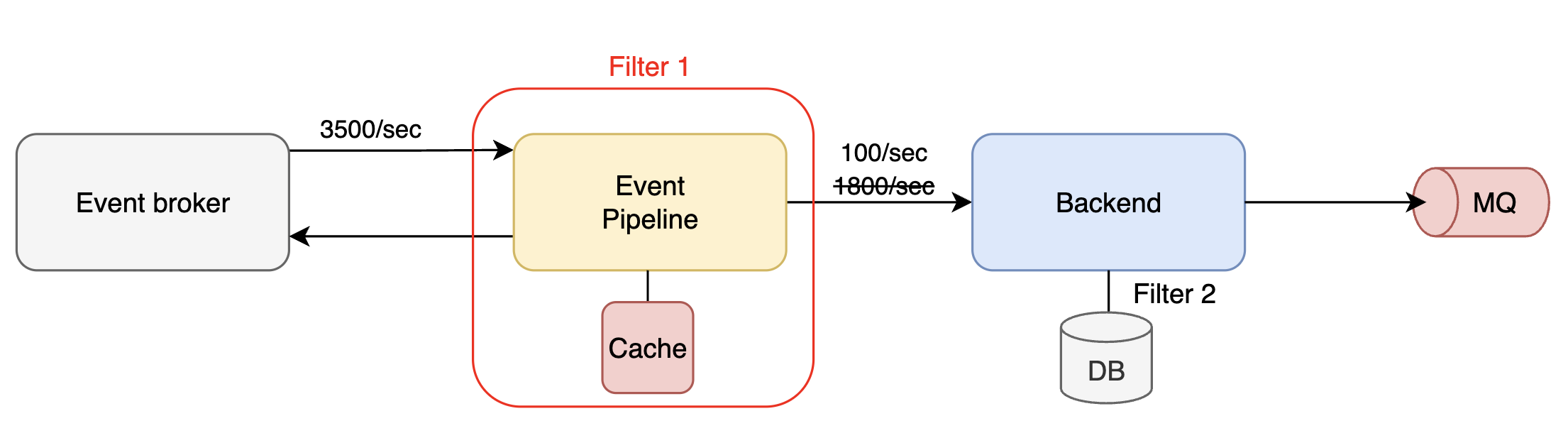 캐시로 DB 액세스 시간이 크게 개선되어 기존에는 비효율적이었던 로직을 개선할 수도 있었다. DB 조회를 바탕으로 이벤트를 필터링하는 로직이 있는데, 기존에는 DB 조회 시간이 커, 처리량 문제로 필터링 처리를 최소화할 수 밖에 없었다. 이벤트를 전달받는 BE 서비스가 대부분의 부하를 감당하는 꼴이었어서, 항상 크 서비스는 불필요하게 과한 리소스와 불안정한 메모리 변화를 보였다.