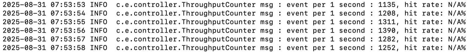 아래는 한 프로세스에서 캐시를 적용하기 전의 초당 이벤트 처리 수에 대한 로그이다. 초당 약 1200개의 이벤트를 처리할 수 있었다.