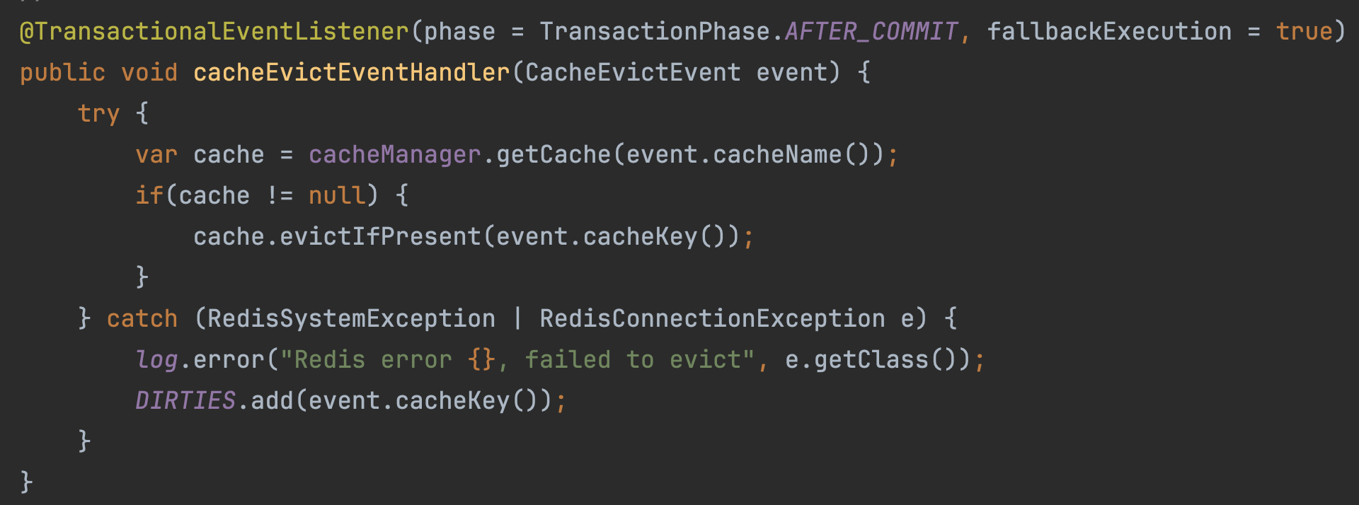 DB Update 후 이를 캐시를 반영했으나 트랜잭션에 의해 DB가 롤백되면, DB와 캐시 정합성이 깨지는 문제가 발생한다. 이런 정합성 불일치를 방지하기 위해 TransactionalEventListener을 사용, 트랜잭션이 Commit 된 이후에 캐시가 반영될 수 있도록 보장한다.