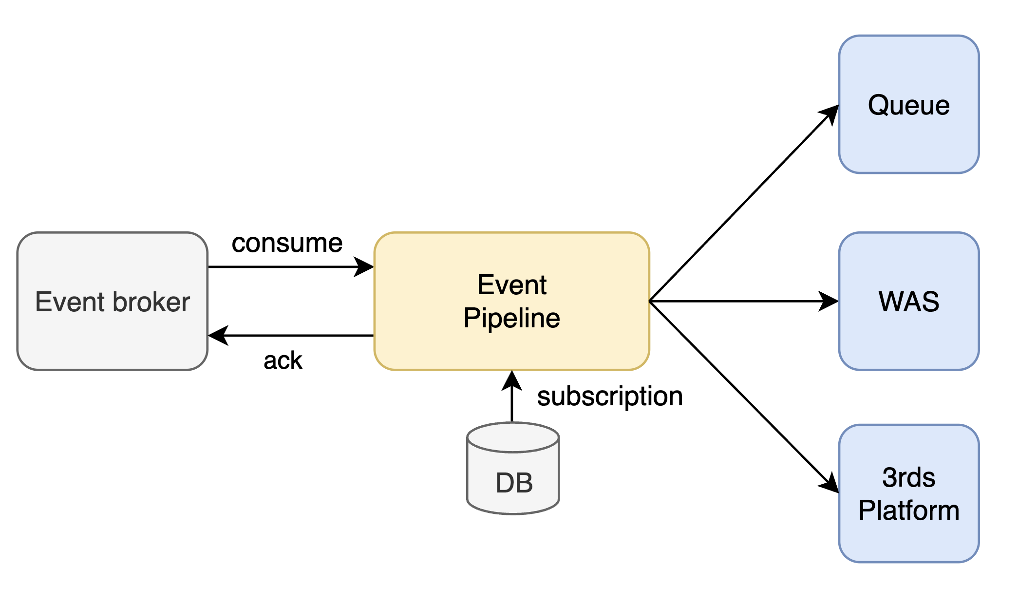 우리 회사 기기는 삼성의 Smartthings, LG의 ThinQ, KT, Genie, Kakao, Clova 등 여러 IoT 플랫폼에서 연동되어 사용된다. 서버는 기기의 이벤트를 외부 서버에 전달하여 해당 플랫폼에서 상태 변화나 알림을 반영될 수 있도록 한다. 이벤트 파이프라인은 기기의 연동 정보를 확인하여 이벤트를 전달하거나, 필터링하는 역할을 한다.