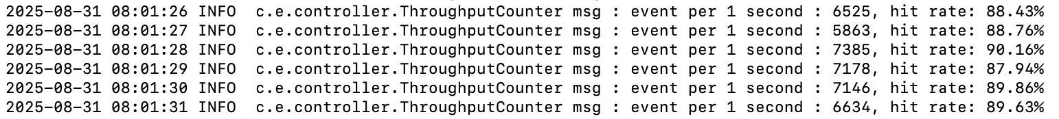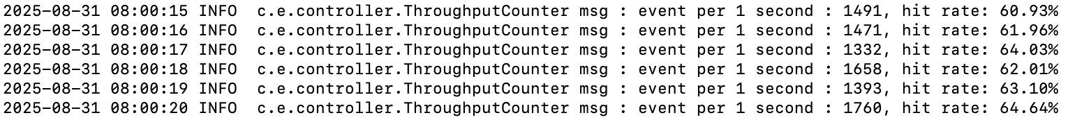 캐시 적용 후의 히트율은 85% ~ 90% 정도에서 안정적으로 유지되고 있다. 같은 조건에서 초당 이벤트 처리 수 로그를 확인하면 평균 6500개가 처리되는 것을 볼 수 있다. 단순 개선률로 따지면 441.67%으로, 약 4.4배의 큰 개선을 만들 수 있었다. 다중 프로세스로 이벤트를 처리하고 있었던 이전에서, 이제는 HA를 고려하지 않는다면 단일 프로세스로 이벤트로 처리해도 충분히 초당 3500개의 이벤트 유입량을 처리할 수 있겠다.