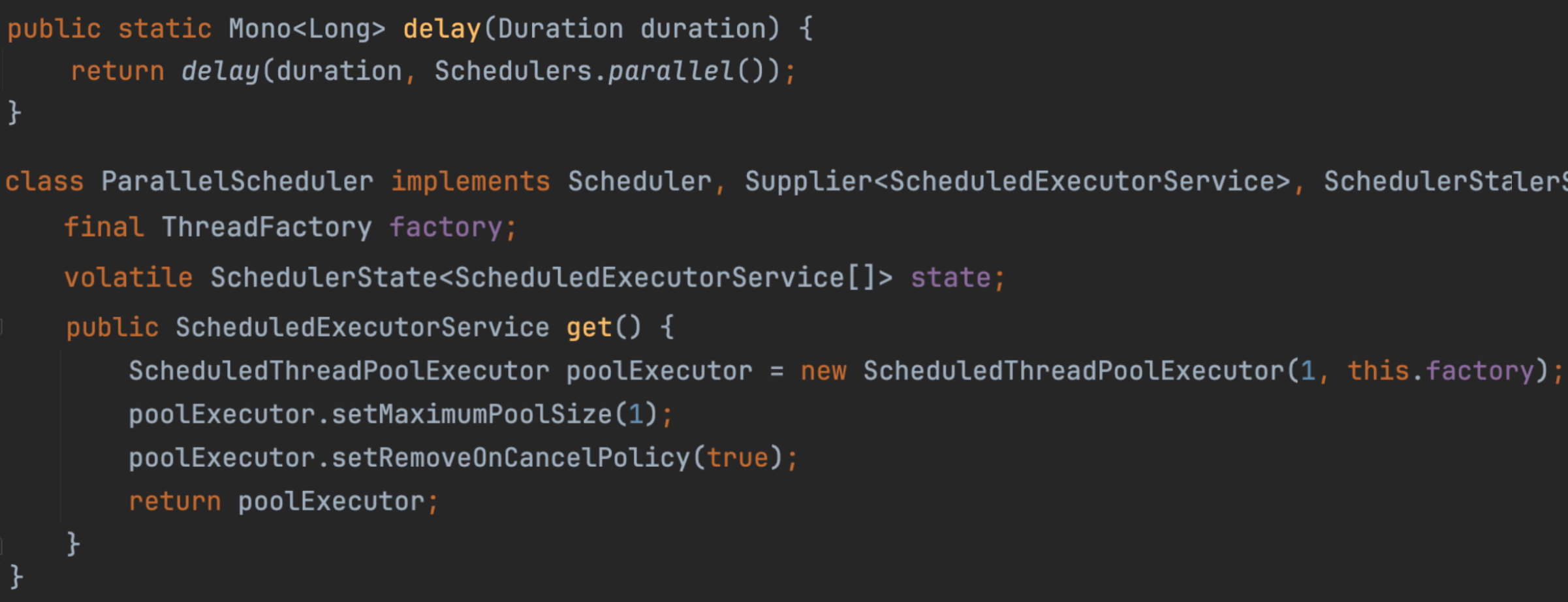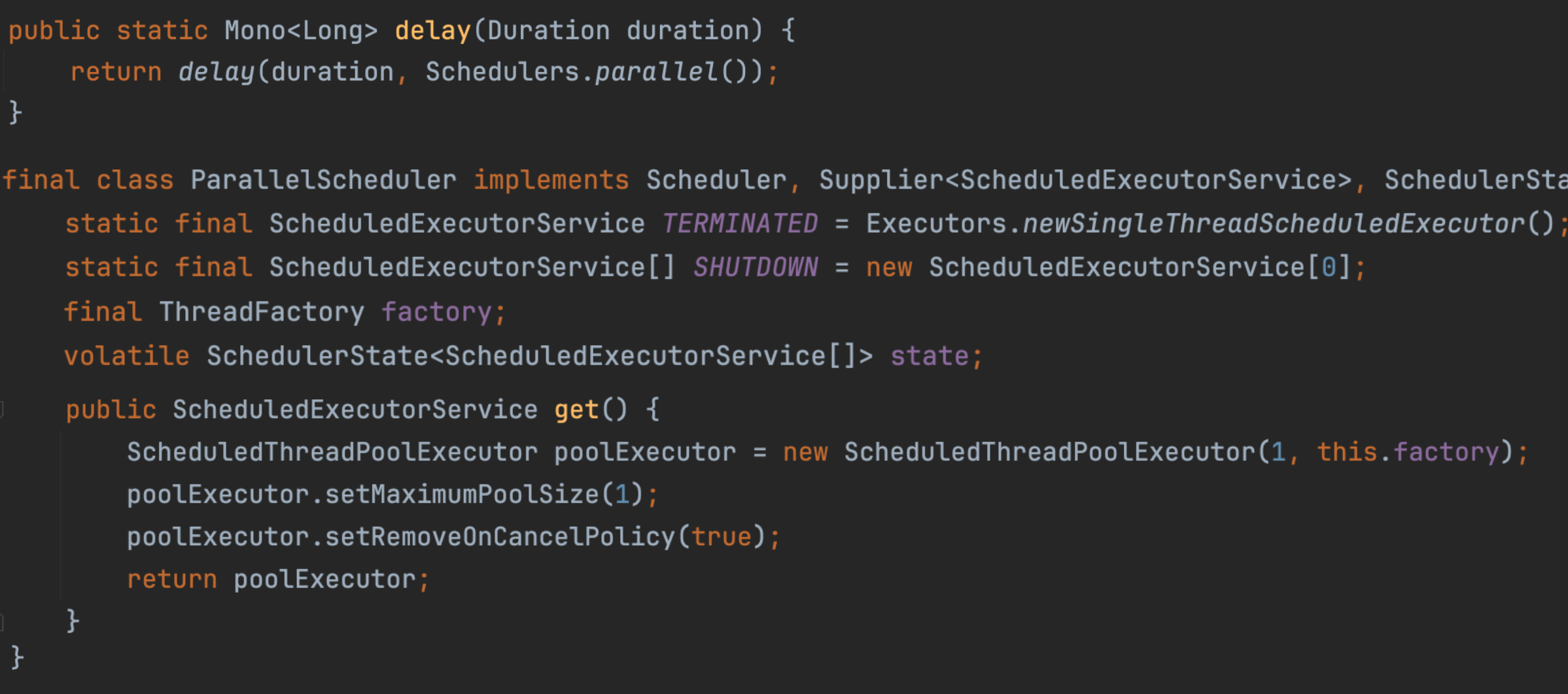 Mono.delay는 스케줄러를 따로 지정하지 않으면, Schedulers.parallel()를 기본으로 사용한다. Schedulers.parallel()의 생성 과정을 쭉 타고 들어가다 보면 결국 아래의 ParallerScheduler 임을 찾을 수 있다. 여기서 ScheduledExecutorService의 구현체로 ScheduledThreadPoolExecutor를 사용한다는 점이 포인트다. 이를 state라는 변수로 여러 개 들고 있다.