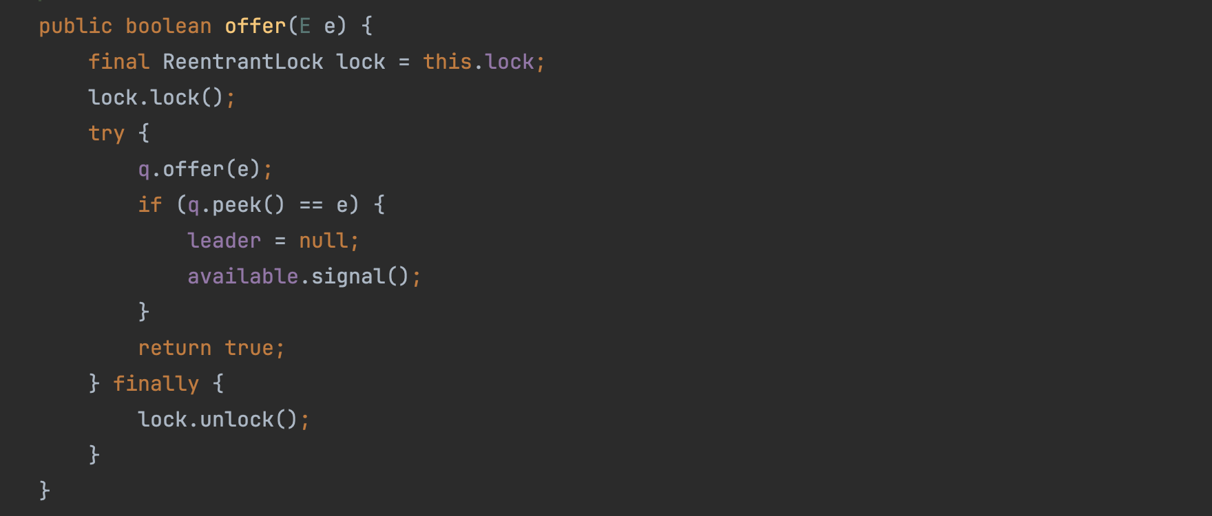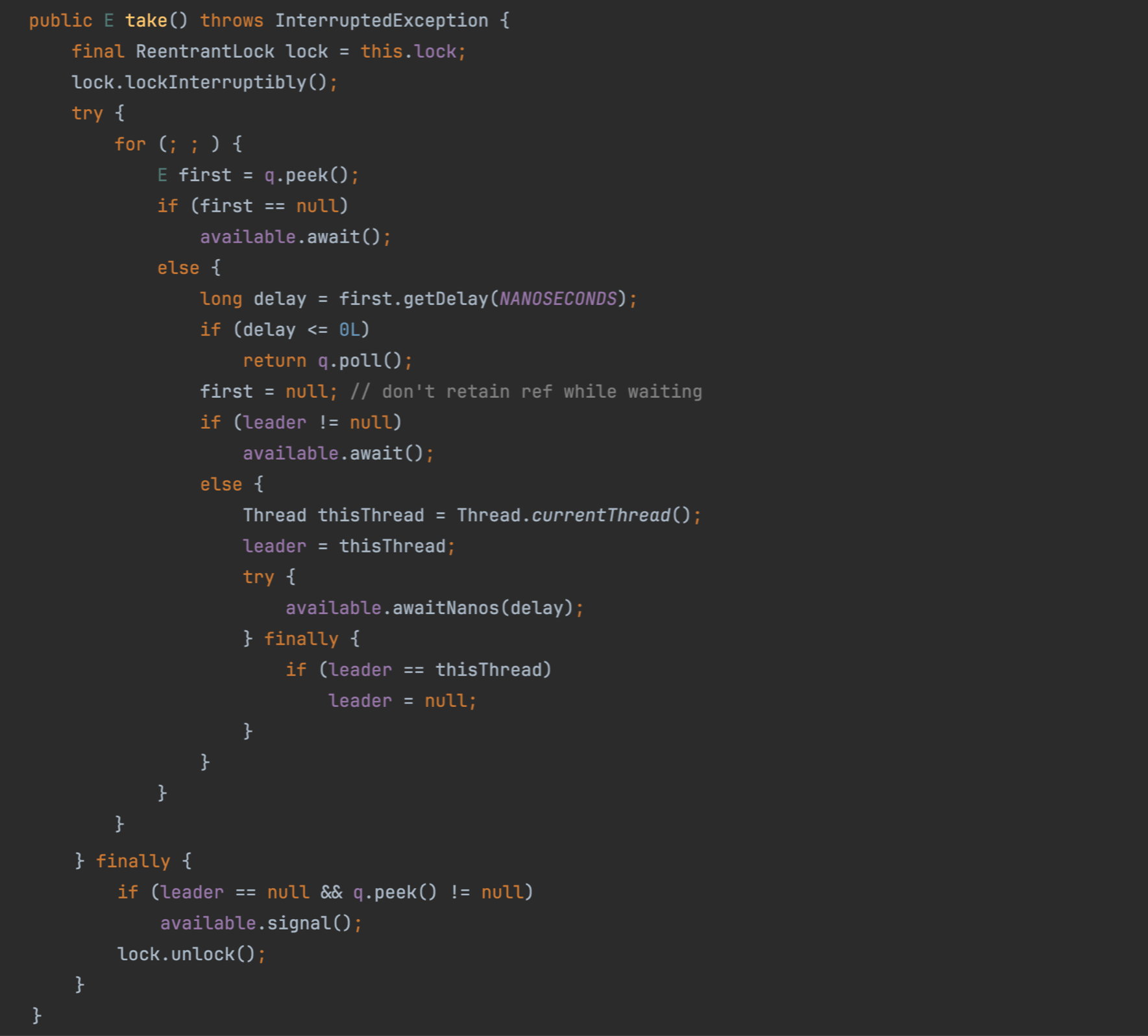 딜레이 시간이 남아 있는 경우가 중요하다. Condition.awaitNanos()로 스레드를 남은 시간 동안 대기 상태로 한다. 지정한 딜레이 시간이 끝나면 대기 상태에서 벗어나 반복문을 돌 것이고, 다시 우선 순위 큐에서 아이템을 꺼내게 되면, 이번에는 딜레이 시간을 지난 경우가 되어 해당 아이템을 반환하게 되는 것이다. 이때 leader 변수는 현재 대기 상태 중인 스레드를 표시한다.
