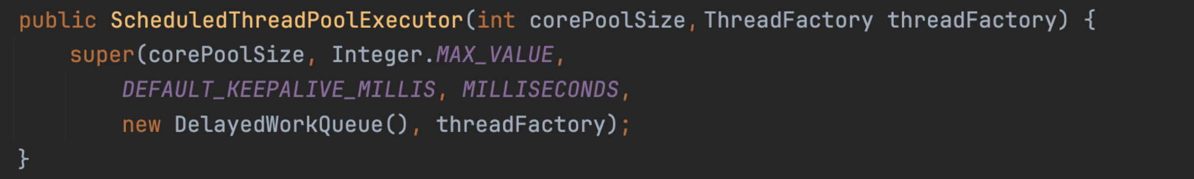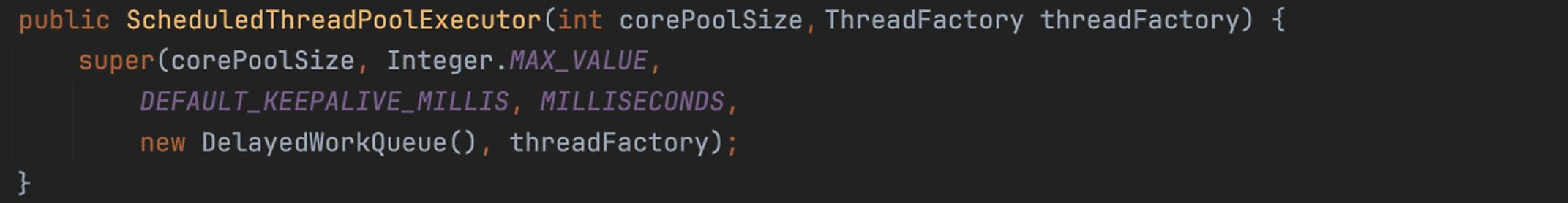 ScheduledThreadPoolExecutor의 생성자를 확인하면 대기열로 DelayedWorkQueue를 사용하는 것을 볼 수 있다. DelayedWorkQueue는 아이템을 적재할 때 만료 시간을 함께 등록하고, 아이템을 요청하면 대기 후 만료 시간이 된 아이템을 반환한다. 즉, ScheduledThreadPoolExecutor는 작업을 배정하면 큐에 딜레이 시간과 작업을 적재하고, 큐에서 딜레이 시간이 만료된 작업이 반환되면, 이를 스레드에서 수행하는 것으로, 딜레이 후 작업 수행이 가능해진다.