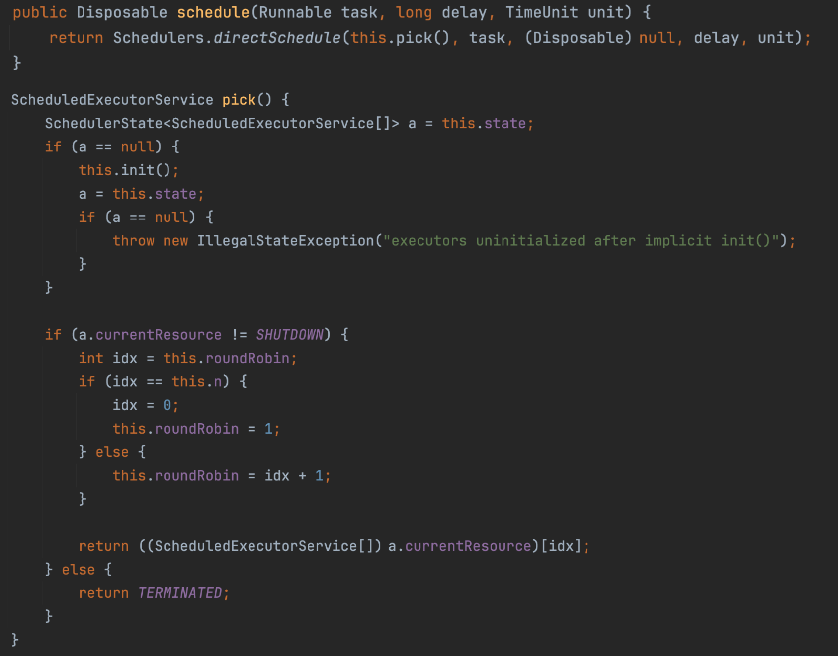 ParallerScheduler에 작업과 딜레이 시간을 등록하면, pick 메서드에서는 라운드 로빈으로 ScheduledThreadPoolExecutor 중 하나를 선택한다. Schedulers.directSchedule를 까보면, 선택한 ScheduledThreadPoolExecutor에 작업이 배정되는 것을 확인할 수 있다.