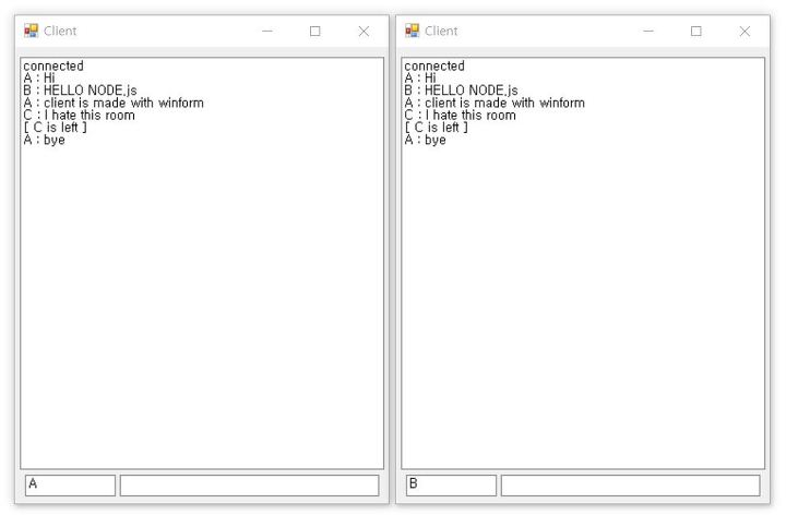 윈폼 클라이언트가 Node.js 서버를 통해 통신하는 모습