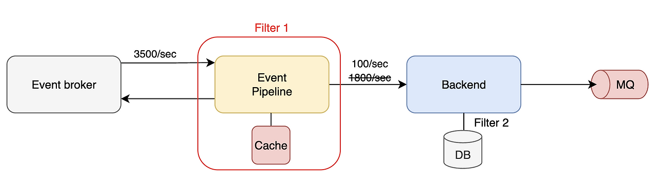 처리량을 높이고, 유입량을 줄이는 방법을 고민했다. 문제가 되었던 서비스에 이벤트를 전달하는 파이프라인에서 미리 필터링을 하는 방법을 고안했다. 문제가 되었던 서비스로의 이벤트 유입 수는 줄일 수 있겠지만, 전면 이벤트 파이프라인에서 필터링을 위한 DB 조회 로직이 추가되고, 파이프라인 전체가 느려지는 성능 문제가 생겼다. 이는 글로벌 캐시를 도입하여 해결했다. 이벤트 파이프라인에서 필터링에 필요한 DB 조회에 캐시를 적용하여, 조회 시간을 크게 줄일 수 있었다. ( 캐시 도입 : 이벤트 파이프라인 처리량 높이기 )