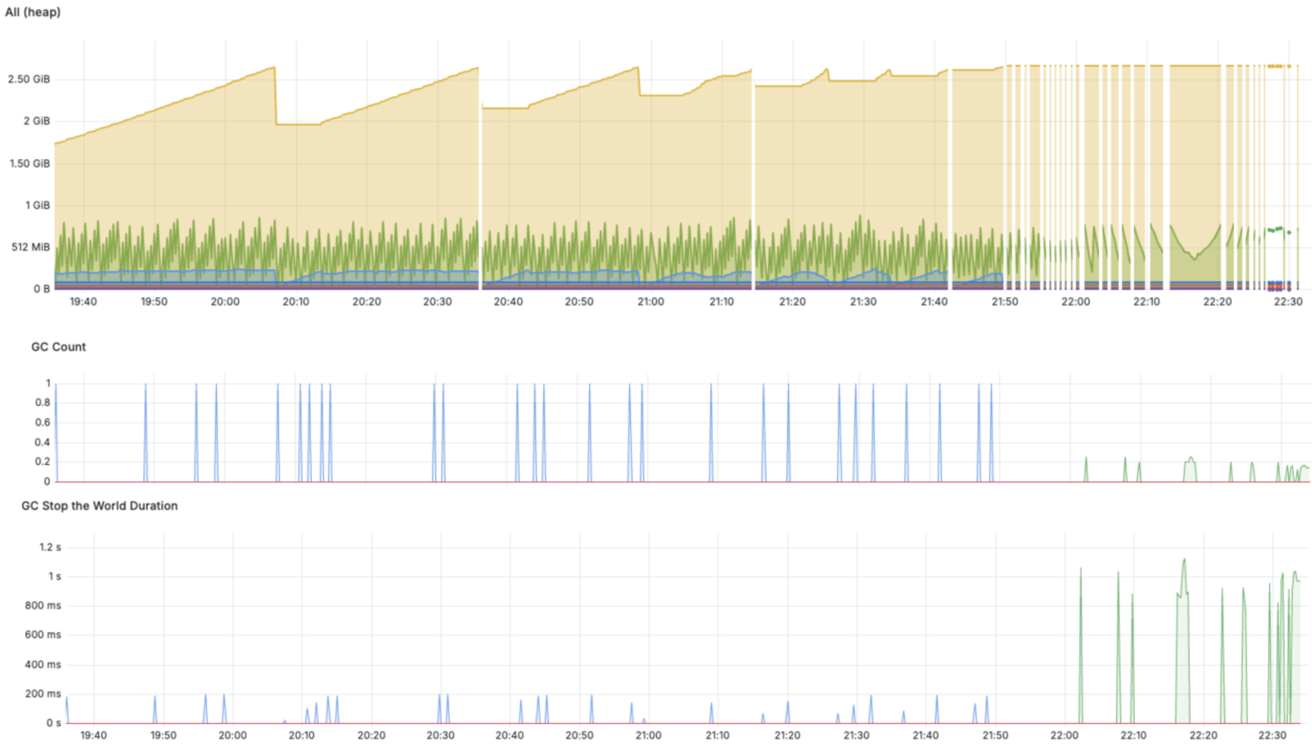가장 먼저 그라파나 대시보드를 살폈다. Heap 메모리와 GC 의 동작을 확인했다. GC 동작 이후에도 Old Gen의 최저 수위가 점점 높아지는 것을 볼 수 있다. Major GC의 처리 대상이 되지 못하는 메모리 영역이 계속 쌓이고 있고, 긴 Stop the world 시간과 함께, Major GC 수행만 반복되는 것을 확인할 수 있다. GC 처리에도 메모리가 줄지 않고 계속 늘어, 결국 Old gen이 가득 차, OOM으로 서버가 비정상 종료된 것임을 확인할 수 있었다.