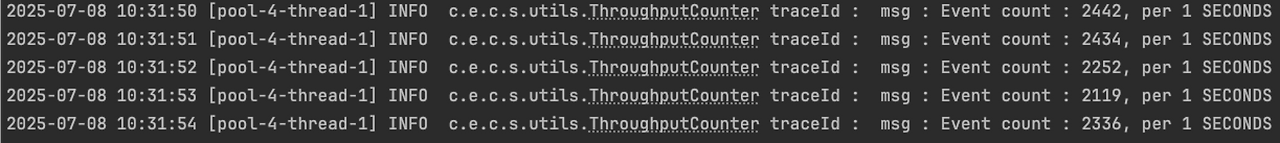 적용 결과는 매우 효과적이었다. 메시지 처리 사이클이 매우 짧아졌고, DB에 데이터 적재에도 지연이 없었다. MongoDB 쪽의 매트릭도 이상 없었다. 아래는 개선 전후의 처리량을 확인하기 위한 로그이다. 명확한 계산을 위해 테스트를 위한 컨슈머 스레드는 단일로 구성했다.