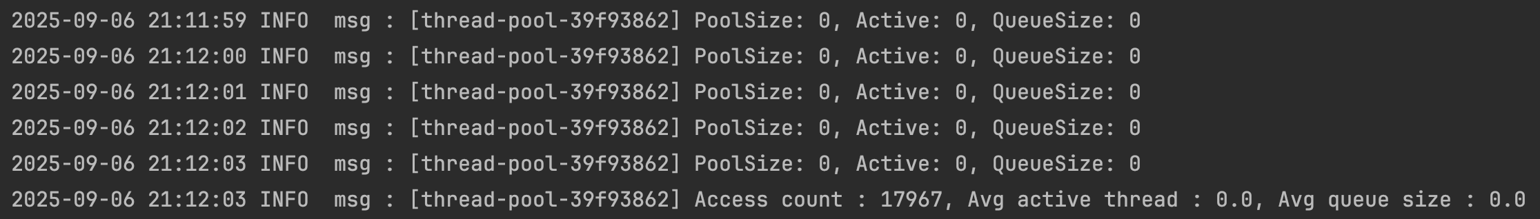 위는 5분 동안 70개의 가상 사용자가 문제 Api에 동시 요청을 진행한 결과이다. 1초에 한번 스레드 풀의 활성 스레드 개수와 큐 개수를 집계하고 이를 출력했다. 5분을 마치고는 그 기간 동안 처리한 요청 수와 평균값을 출력한다.