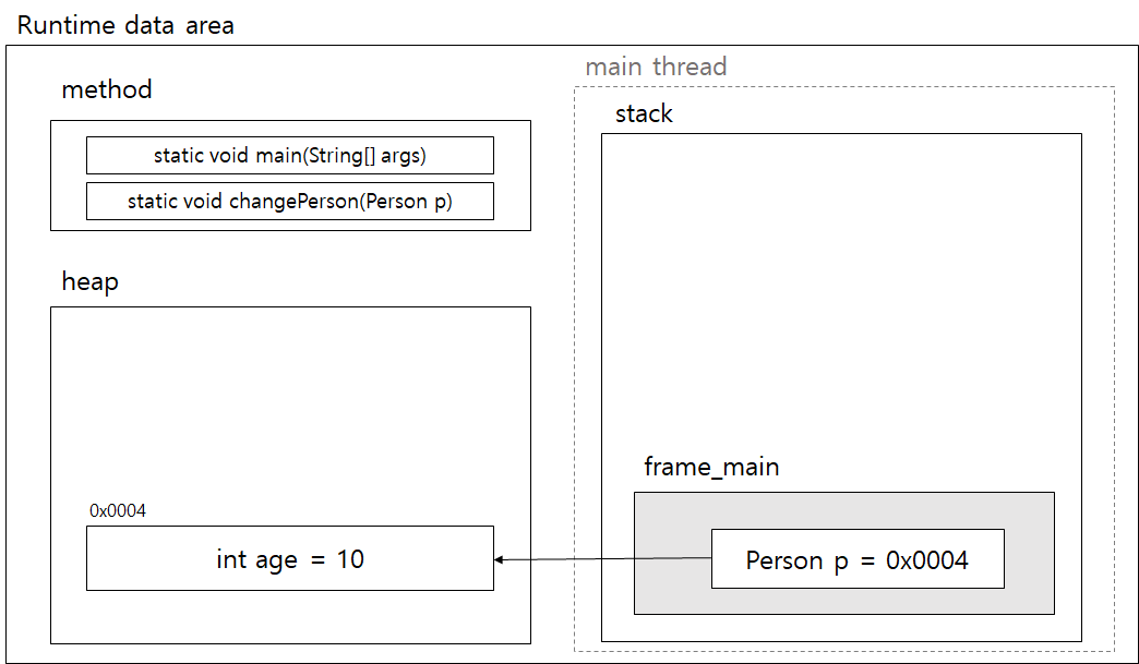 changePerson이 호출되고, 매개변수 p에 인자 p가 대입했을 때까지를 그리면 다음과 같을 것이다.